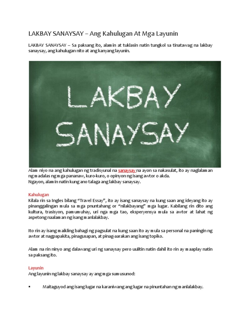 2372019 LAKBAY SANAYSAY Sa paksang ito alamin at tuklasin natin tungkol sa tinatawag na lakbay sanaysay ang kahulugan nito at ang kanyang layunin. Ito ay ang mas striktong anyo ng panitikan na mas maingat ang pagkakagawa. 17102016 Ang naging realisasyon ko sa aking paglalakbay na ito ay huwag mong kakalimutan ang mga lugar na talaga namang dapat mong ipagmalaki na sa inyo lang matatagpuan.