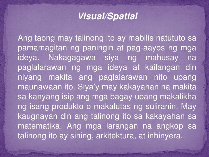 155 Kahit na ang pangako ay waring. Mga Halimbawa at Obserbasyon. Visual or Spatial- Ang mga taong may talinong visualspatial ay mabilis matuto sa pamamagitan ng paningin at mag-ayos ng mga ideya.
