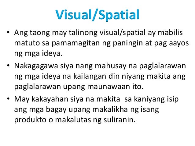 Ang pagtiyak sa pagkakapantay-pantay ay isang mahalagang paksa. Ang bawat isa sa mga pagpipilian ay nagpapahiwatig ng isang uri ng katalinuhan na nabanggit sa itaas. 29072014 Kahulugan ng Biswal o Spatial -ito ang pagkakaroon ng abilidad ng biswalidad sa mga bagay at nakakagawa ng produkto base sa mga biswalidad sa imahinasyon ng isang tao.