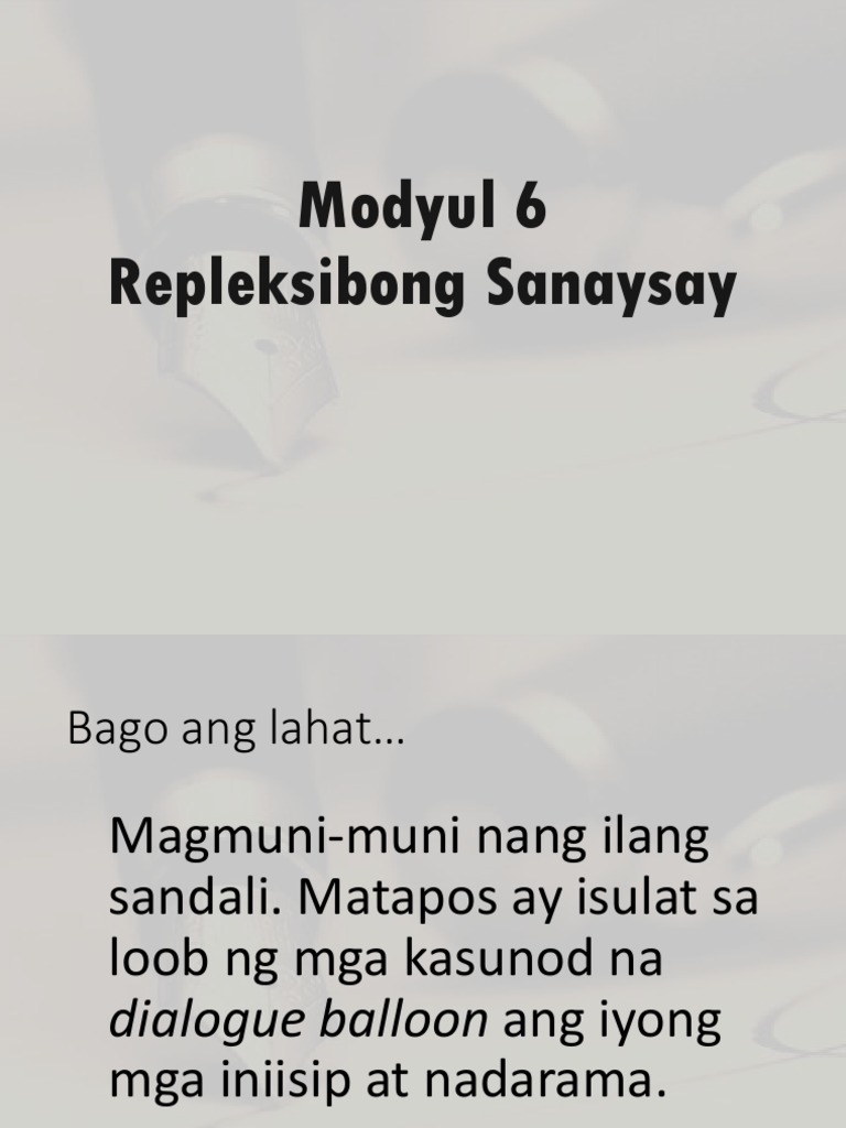 Ang Replektibong Sanaysay ay isang uri ng sulating pampanitikan na isang uri tuluyan o prosa. Ang bahaging ito ang pinakamahalaga dahil dito nakasalalay kung ipagpapatuloy ng mambabasa ang kanyang binabasa. 1172017 Ang repleksibong sanaysay ay ang pagsusulat at pagsusuri sa sariling damdamin at opinyon sa isang paksya.