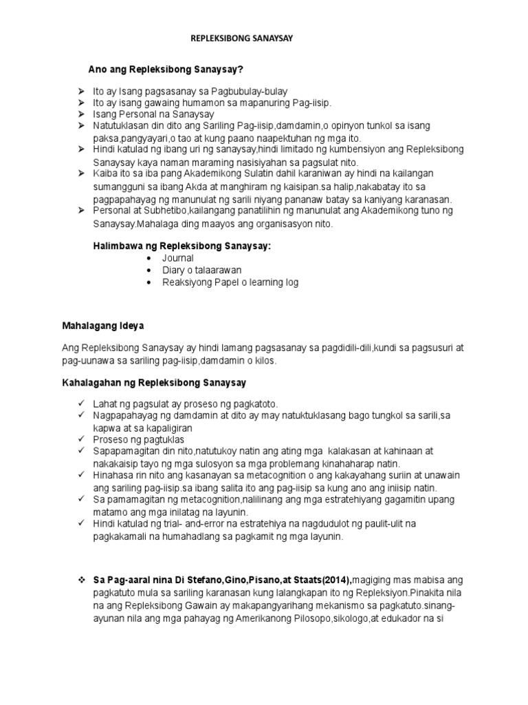 Ang Replektibong Sanaysay ay isang uri ng panitikan na nakapasailalim sa isang anyong tuluyan o prosa. Mutya Publishing House Ang Replektibong sanaysay ay. 1632018 Ayon sa natalakay ang replektibong sanaysay ay nanganngahulugang pag-uulit o pagbabalik tanaw maaaring sa ating napanood o nabasaSa pamamagitan nito ay nagkakaroon tayo ng repleksyon at naibabahagi natin ang sariling karanasan o opimyon sa ibaNaibabahagi rin natin ang ating kaalaman o pananaw at damdamin ukol sa nabasa o napanoodKung mimsan pa ngay sinasabi natin ang mga nagustuhan natin na parte nito.