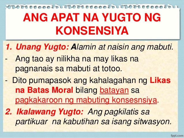 Start studying Apat na Yugto ng Konsensiya. 10122020 Ang konsensya ay katangian na taglay ng tao at ito ang nagsasabi s kung ano ang tama at mali.