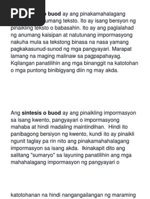 Ang sintesis o buod ay ang paglalahad ng. Pinaiksing bersyon at gamit ang sariling pananalita ng Ito ay mas malikhaing paraan kung saan ang mga. Ang layunin nito ay maka kuha ng importante ngunit maikling sulatin na kumakatawan sa kabuan ng kanyang ibinuod.
