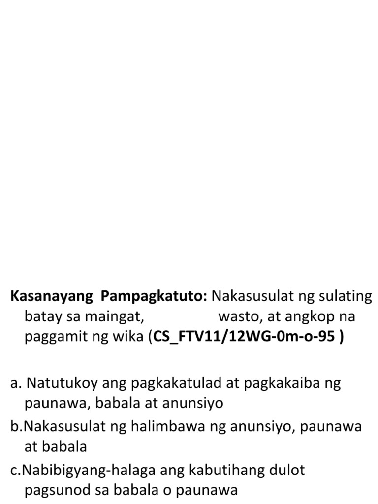May mga pulis na nagpapatupad ng batas ukol sa disiplina sa daan. Sa maayos na pagsulat ng patalastas gamitin ng wasto ang mga sangkap sa pagsulat gaya ng. Ang patalastas ay maikling mensahe na nagpapahatid ng mahalagang impormasyon tungkol sa.