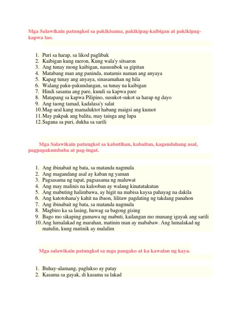 Ang taoy nakikilala sa gawa At hindi sa salita. It is a paramount importance that we know how to harness and control this great force. Ang mga salawikain ay mga kasabihang sumasalamin sa kultura at tradisyon ng mga Pinoy.
