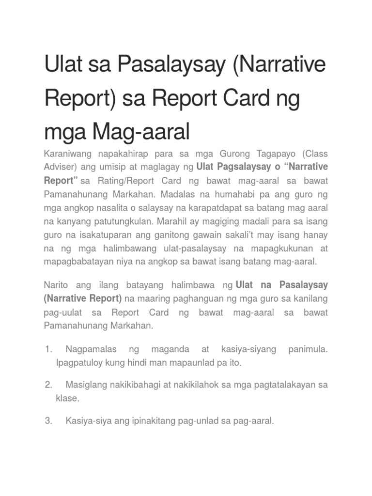 11012015 Narito ang ilang batayang halimbawa ng Ulat na Pasalaysay Narrative Report na maaring paghanguan ng mga guro sa kanilang pag-uulat sa Report Card ng bawat mag-aaral sa bawat Pamanahunang Markahan. Vito Pakil Elementary School October 1993 Narito ang ilang batayang halimbawa ng Ulat na Pasalaysay Narrative Report na maaaring paghanguan ng mga guro sa kanilang pag-uulat sa Report Card ng bawat mag-aaral sa bawat Pamanahunang Markahan. 19032015 Lea ang bida at bayani sa nobela.