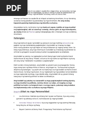 Ang iba pang mga elemento ng Sarsuwela. This type of entertainment was an indigenized verision of vaudeville introduced to the Philippines in the 1910s during the American occupation. 17062018 Ang Mga Halimbawa ng Kalayaan ng Mamayanang Pilipino ay Ang Mga Sumusunod.