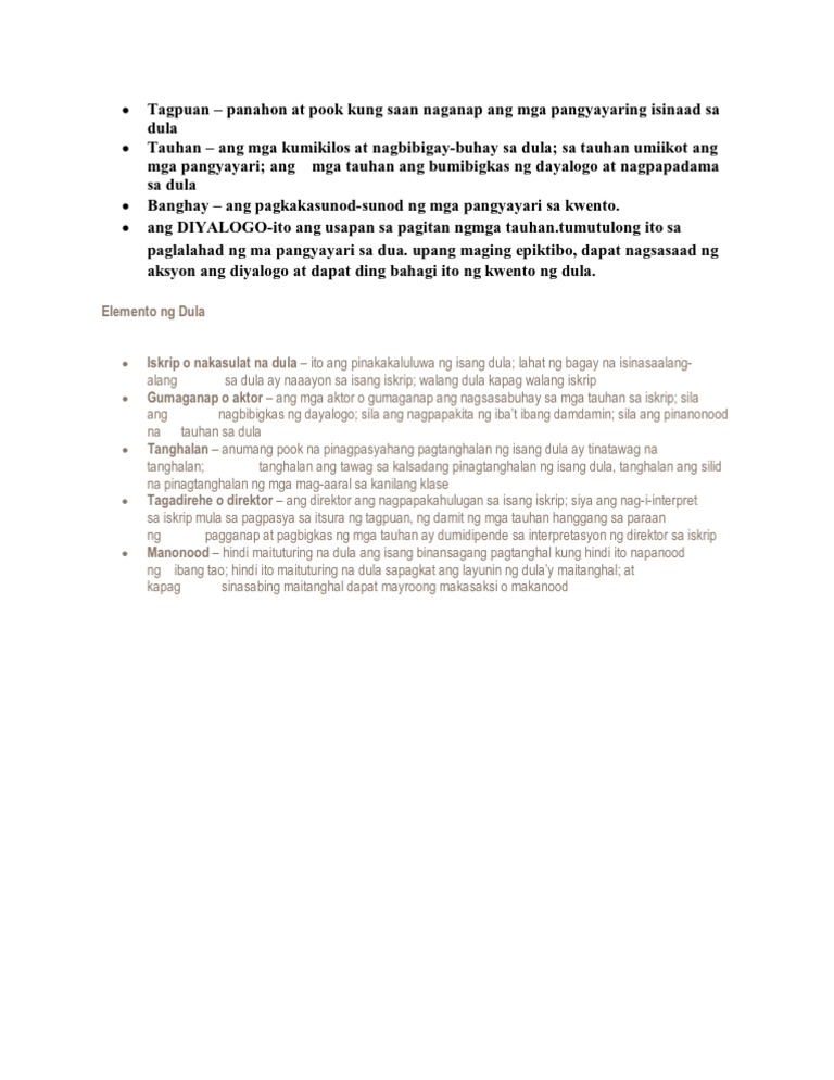 Ang isang dula ay may pitong mahalagang elemento. Nagsisilbi din sila upang ilarawan ang tanawin at lahat ng mga. Namangha ang mga estudyante.