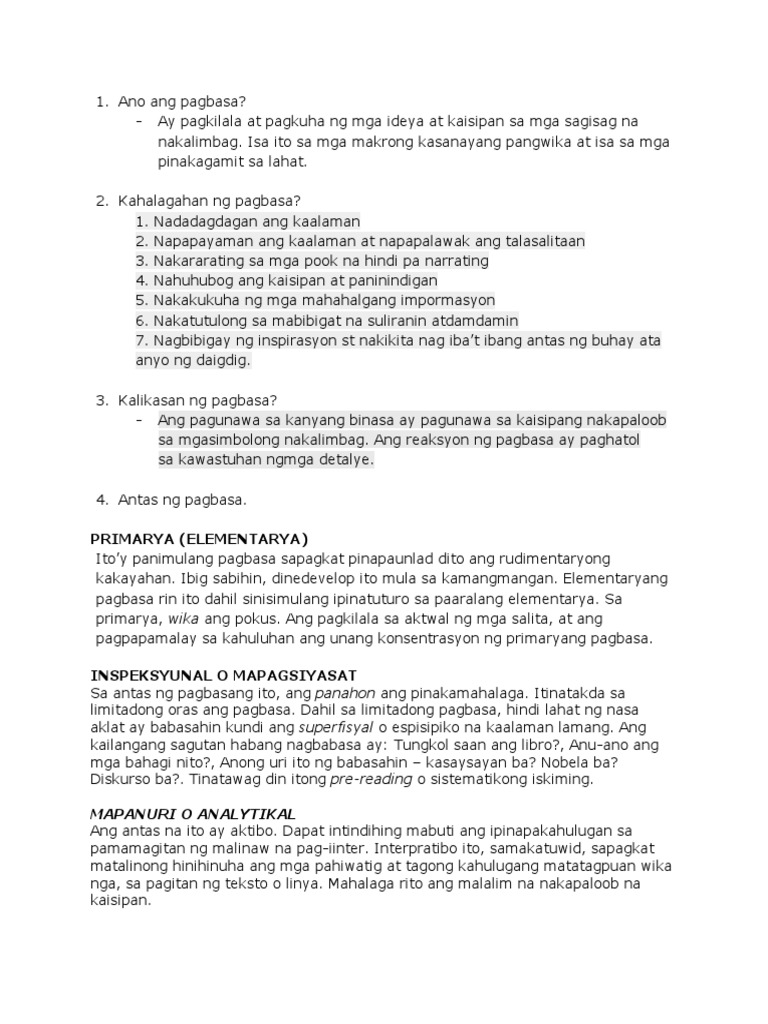 Mga halimbawa ng mapagsiyasat na antas ng pagbasa. Hindi pangkariniwan lamang ang pagkatutong maggawa ng ulat sa mga aklat o kahit man sa mga simpleng mga sulat dahil may pattern itong sinusunod kaya kailangan talaga ang mapagsiyasat na antas. Antas ng Pagbasa Mortimer Adler at Charles Van Doren 1973 Primarya - pinakamababang antas ng pagbasa at pantulong upang makamit ang literasi sa pagbasa - pagtukoy sa tiyak na datos at ispesipikong impormasyon petsa setting lugar o mga tauhan Mapagsiyasat - nauunawaan na ng mambabasa ang kabuuang teksto at nakapagbibigay ng mga hinuha o impresyon tungkol dito - tinitignan ng. Naiaayon ang interpretasyon ng.