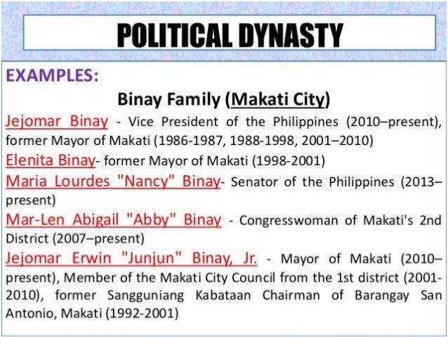 28102016 Isa sa maaaring halimbawa ng political dynasty sa kasalukuyan sa ating bansa ay ang pamilyang Robredo kung saan makikita nating nagsisimula pa lamangKung sa pagdaan pa ng mga panahon at henerasyon ay kasama pa rin sa gobyerno ang pangalang Robredo ito ay isang halimbawa ng political dynasty. Dinastiyang Politikal sa Pilipinas. Komparatibong pagsusuri ng mga editorial cartoon ng Philippine Star at Philippine Daily Inquirer sa pagbisita ni Pope Francis sa Pilipinas 8.