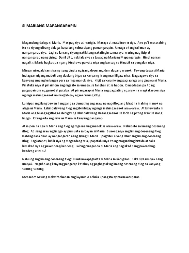 Mga uri ng kwentong bayan may apat na uri ang kwentong bayan. Hindi naman nagalit si Maria bagkos pa ngang ikinatuwa pa yata niya ang bansag na ikinabit sa pangalan niya. Minsan niregaluhan siya ng isang binata ng isang dosenang dumalagang manok.