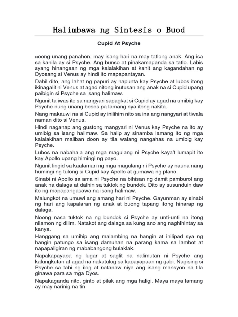 12082018 Ang Sintesis ay ginagamit sa mga tekstong naratibo upang bigyan ng buod tulad ng maikling kwento. Isang paraan ng pagpapaiksi ng babasahin. 25072016 Ang sintesis ay isang halimbawa ng pagbubuod kung saan kukuha ang isang manunulat ng mga maliliit ngunit importanteng parte sa bauuan ng isang sulatin o salaysay.